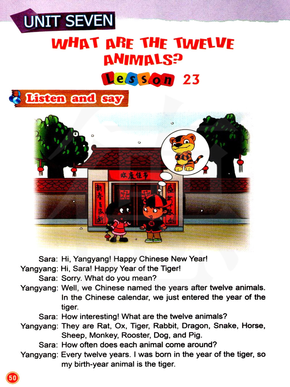 对不起。你是什么意思? 嗯~,我们中国人用十二个动物来命名年份。 在中国的日历里,我们刚刚进入虎年。