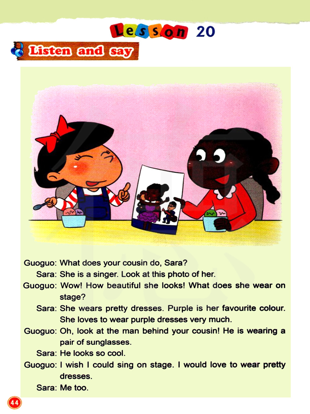 我希望我能在台上唱歌。我爱穿漂亮的服装。 我也是。