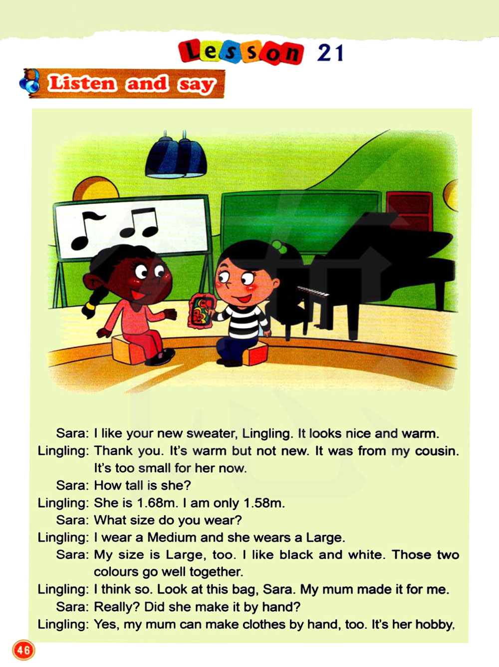 我喜欢你的新毛衣,玲玲。它看上去又好看又暖和。 谢谢。它暖和但不是新的。它是我表姐的。现在她穿着太小了。