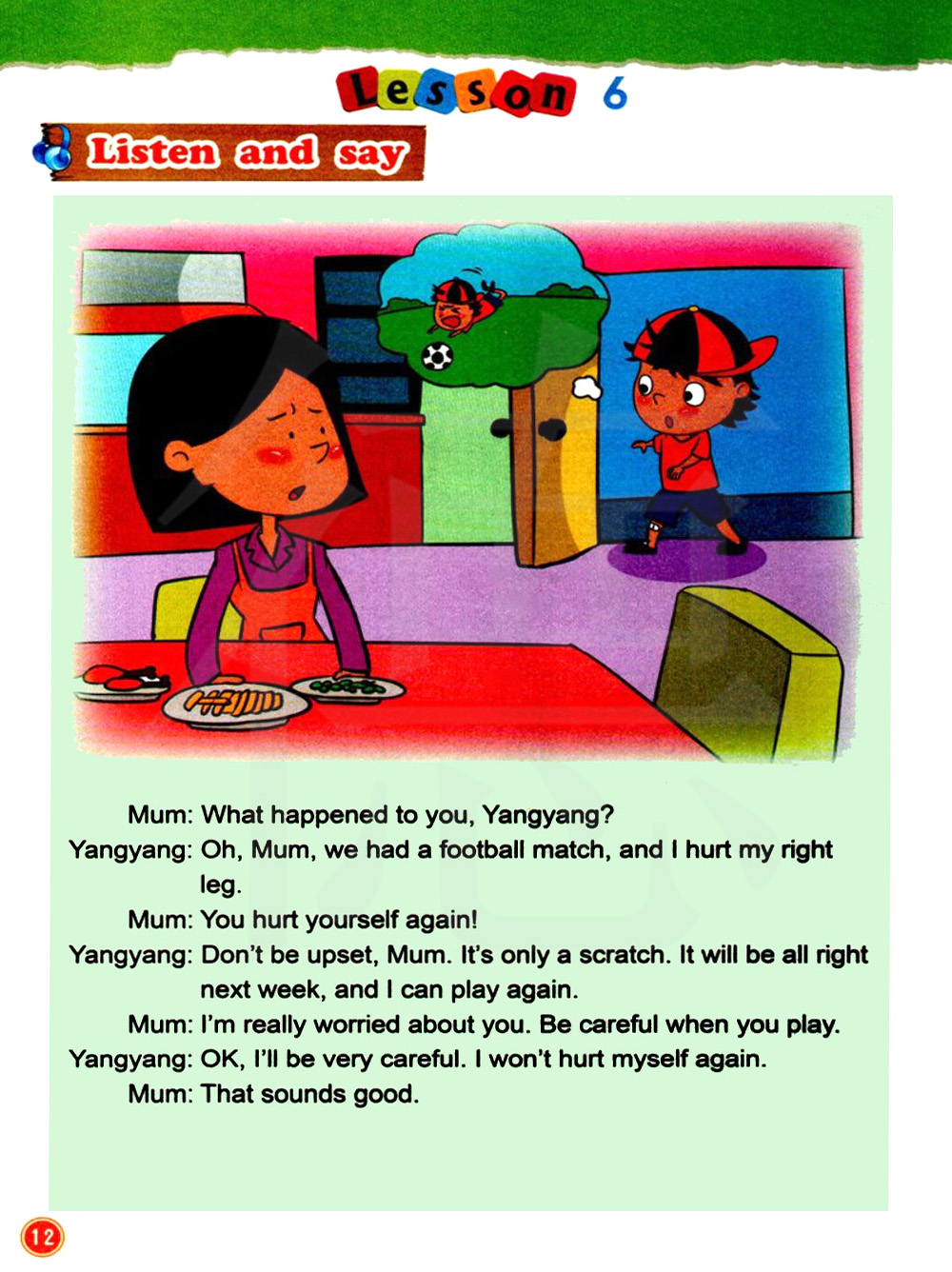 阳阳,你怎么了?哦,妈妈,我们足球比赛, 我的右腿受伤了。