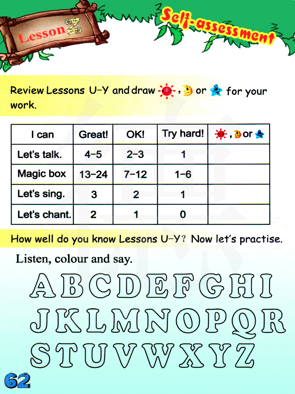 复习第U-z课并为你的作业画一画太阳,月亮或者星星。