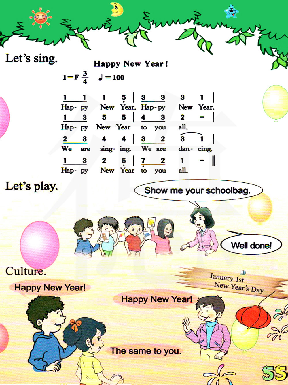 新年快乐,新年快乐。祝你们大家新年快乐。我们唱歌,我们跳舞,祝你们新年快乐。