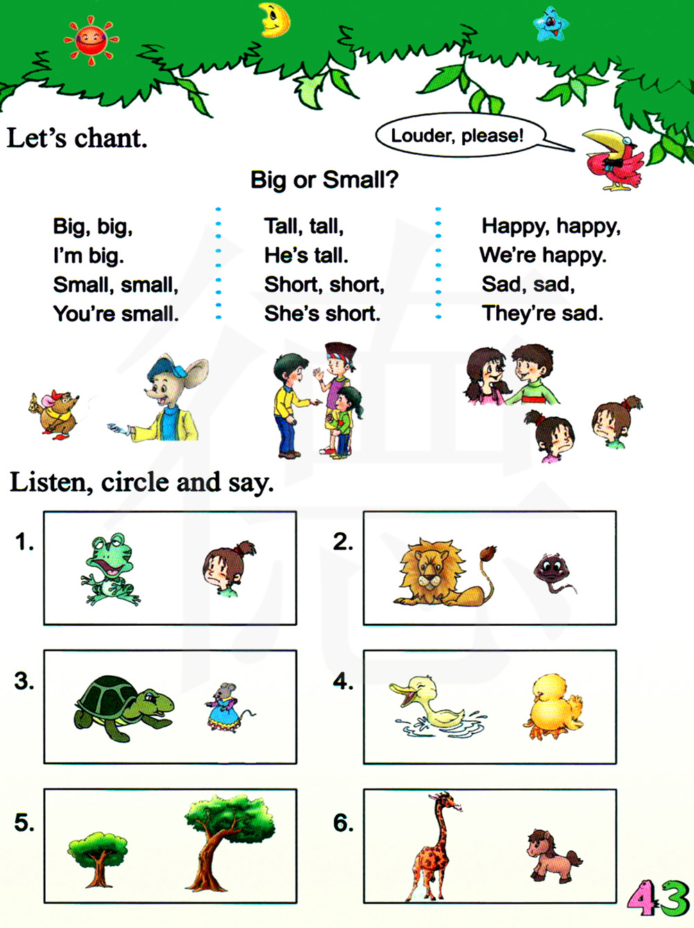 大的,大的,我是大的,小的,小的,你是小的。高的,高的,他是高的,矮的,矮的,她是矮的。快乐的,快乐的,我们是快乐的,悲伤的,悲伤的,我们是悲伤的。