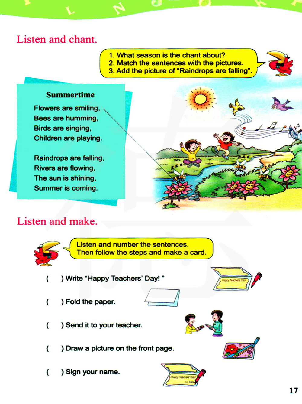 听录音并给句子编号,然后按照步骤做一张卡片