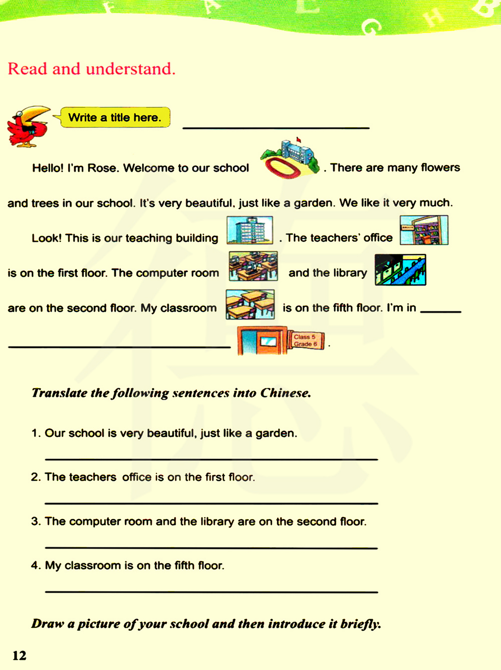 看。这是我们的教学楼,教室办公室在一楼。电脑室和图书馆在二楼。我的教室在五楼,我在六年级三班