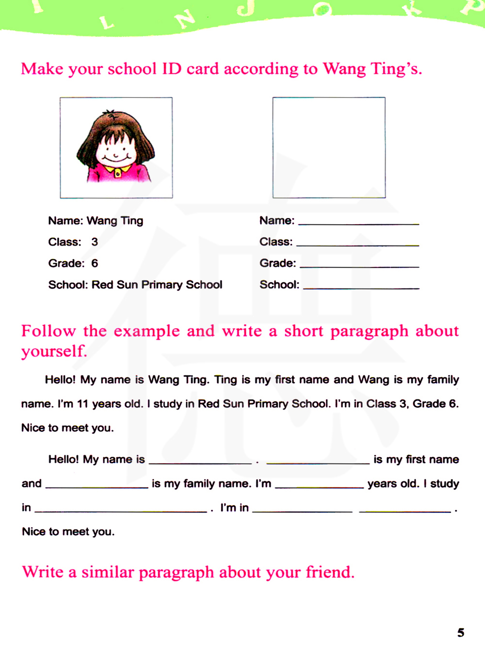 你好,我的名字叫王婷,婷是我的名字,王是我的姓,我十一岁,我在红日小学上学,我在六年三班,很高兴认识你