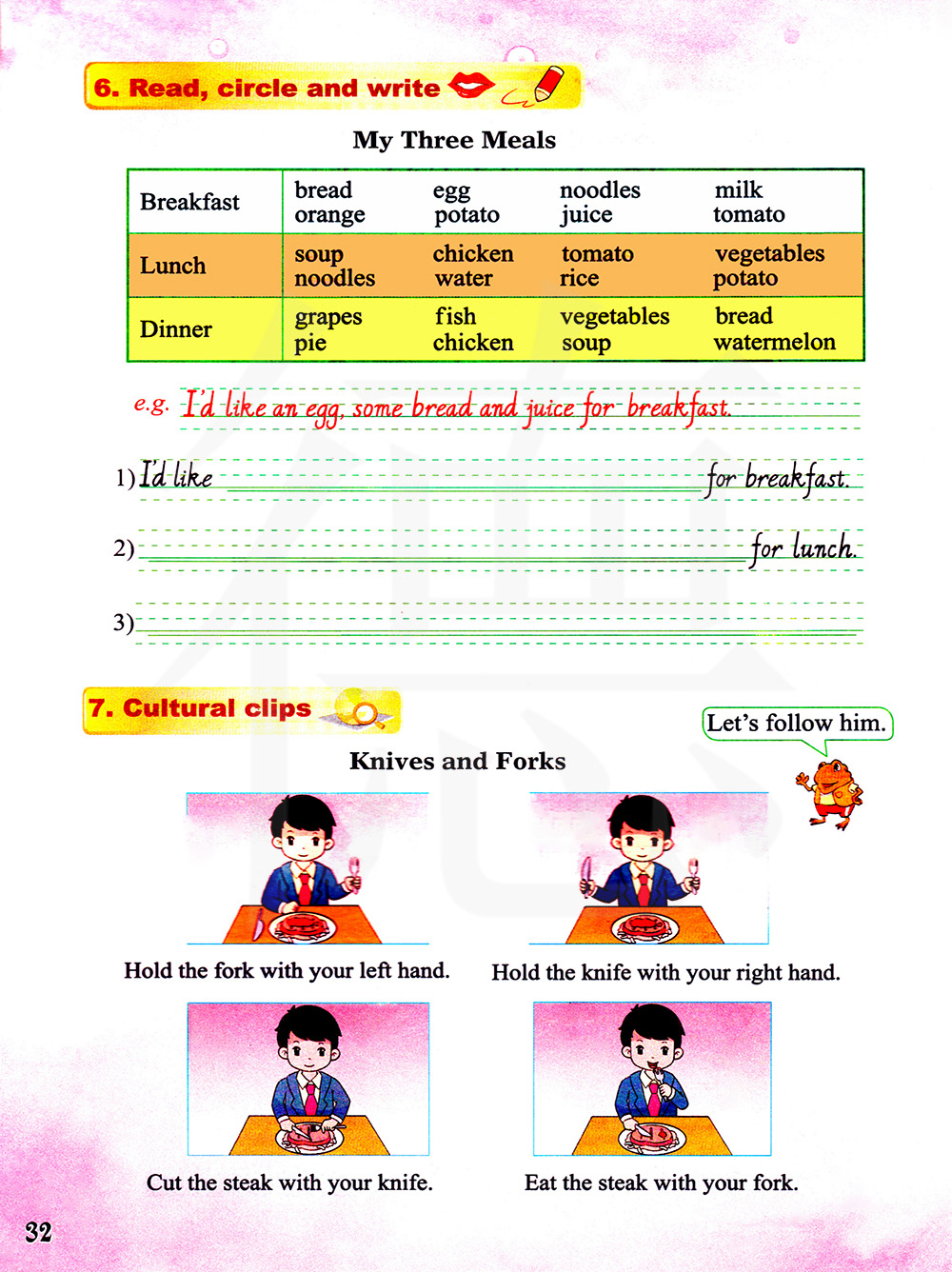 例如:早餐我想要一个鸡蛋,一些面包和果汁。