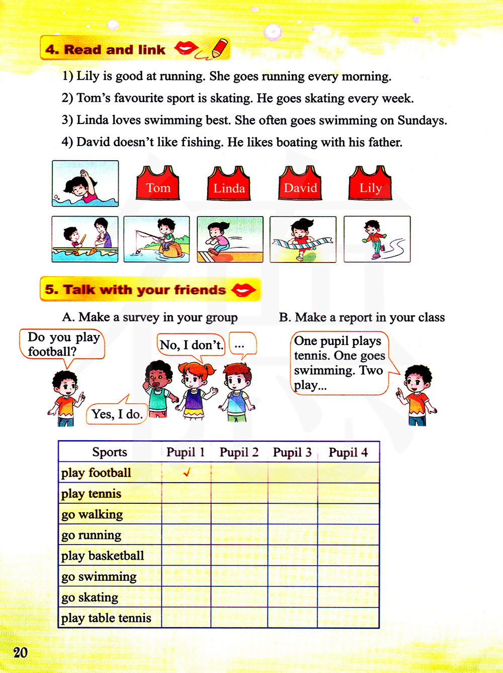 一个小学生打网球,一个去游泳,两个玩……