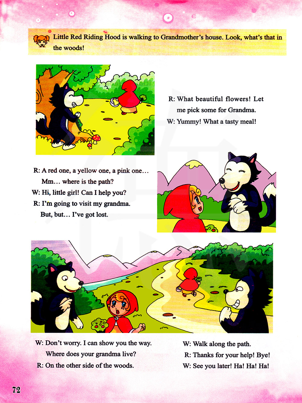 一朵红的,一朵黄的,一朵粉的...嗯...路在哪里?嗨,小女孩!需要帮忙吗?我要去看望我的外婆。但是,但是...我迷路了。