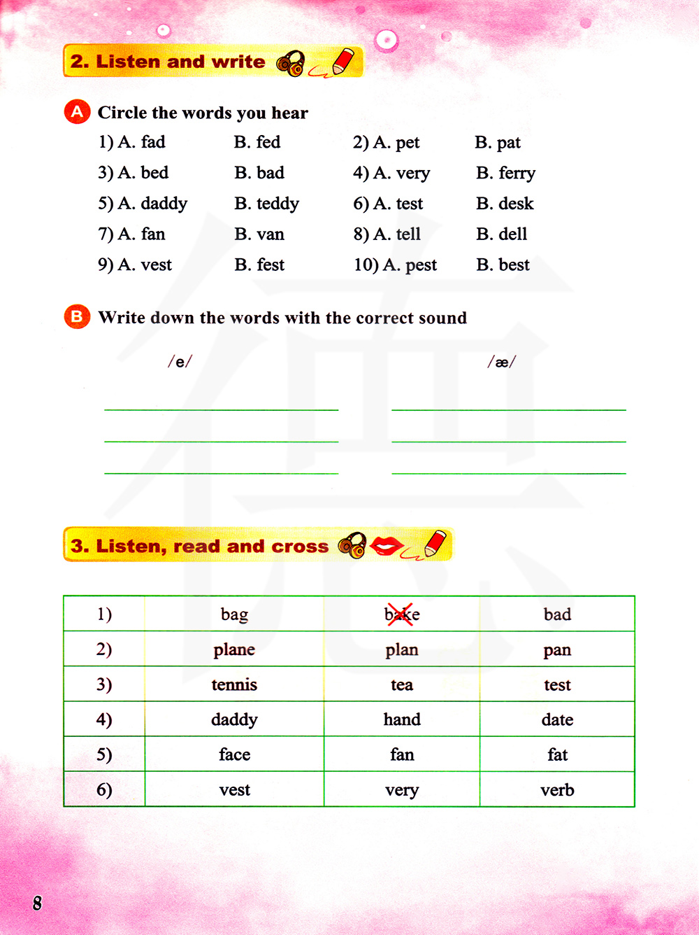 1)包 烘烤 坏的 2)飞机 计划 平底锅 3)网球 茶 测验