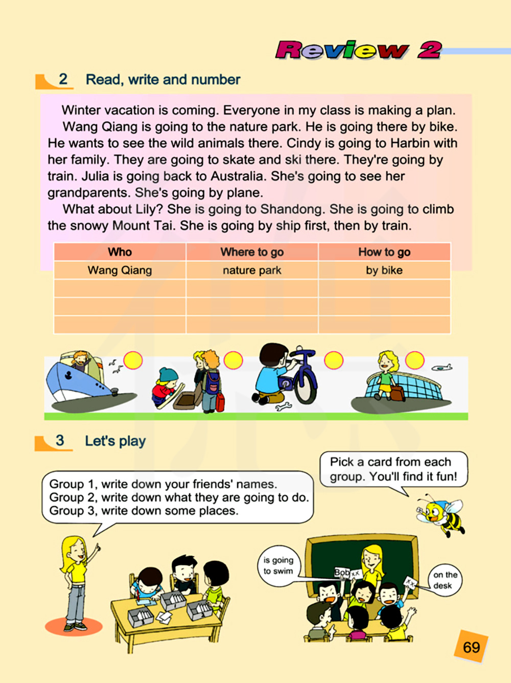 王强打算去大自然公园,他打算骑自行车去那里,他想去那里看野生动物。辛迪打算和家人一起去哈尔滨,他们打算去那里滑冰和滑雪,他们打算坐火车去那里。茱莉亚打算回澳大利亚,她打算看望她的外祖父母,她打算坐飞机去。
