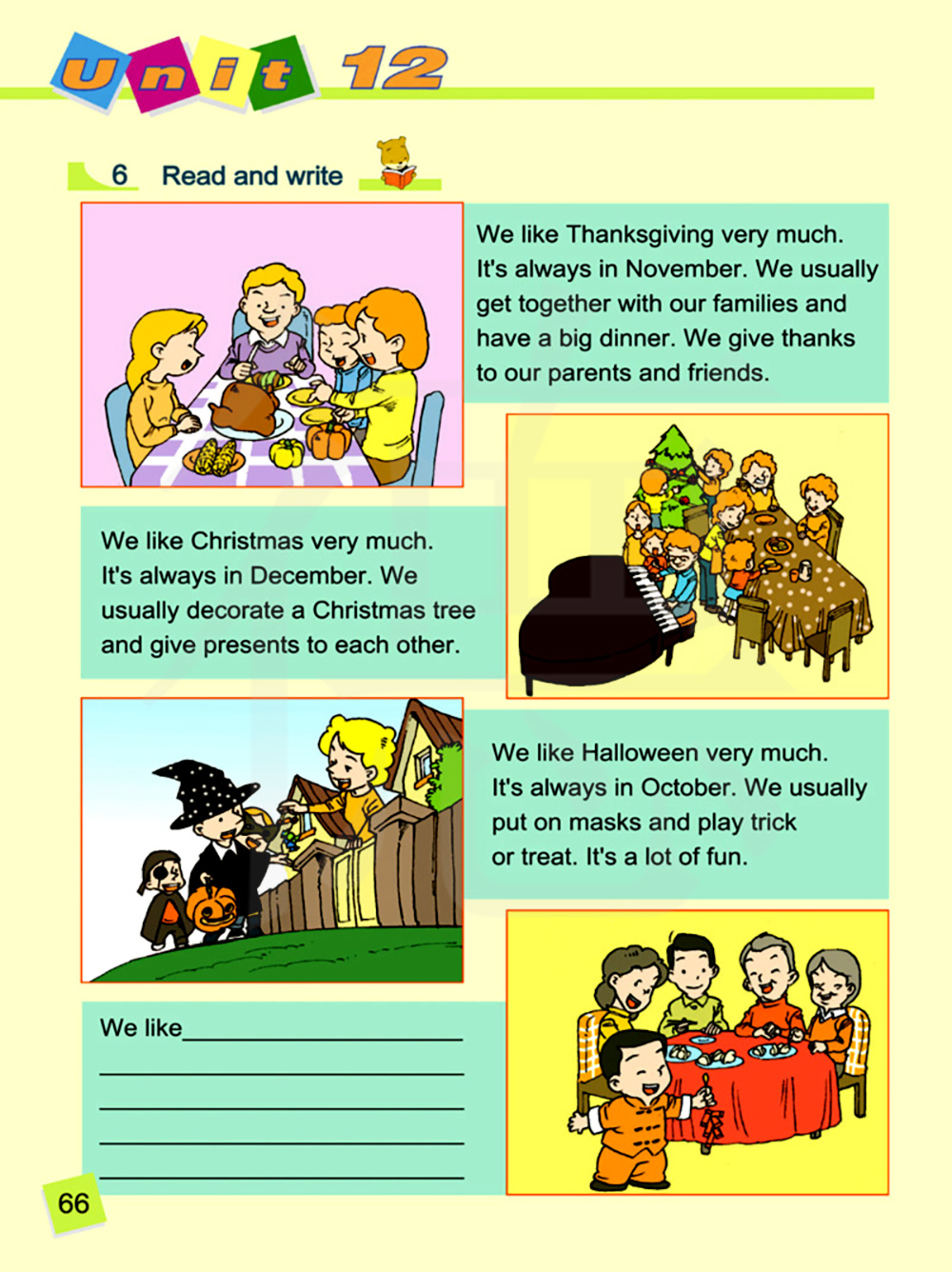 我们很喜欢感恩节。它通常在11月份。我们通常会一家人聚在一起并且吃丰盛的晚餐,我们会感谢我们的父母和朋友。