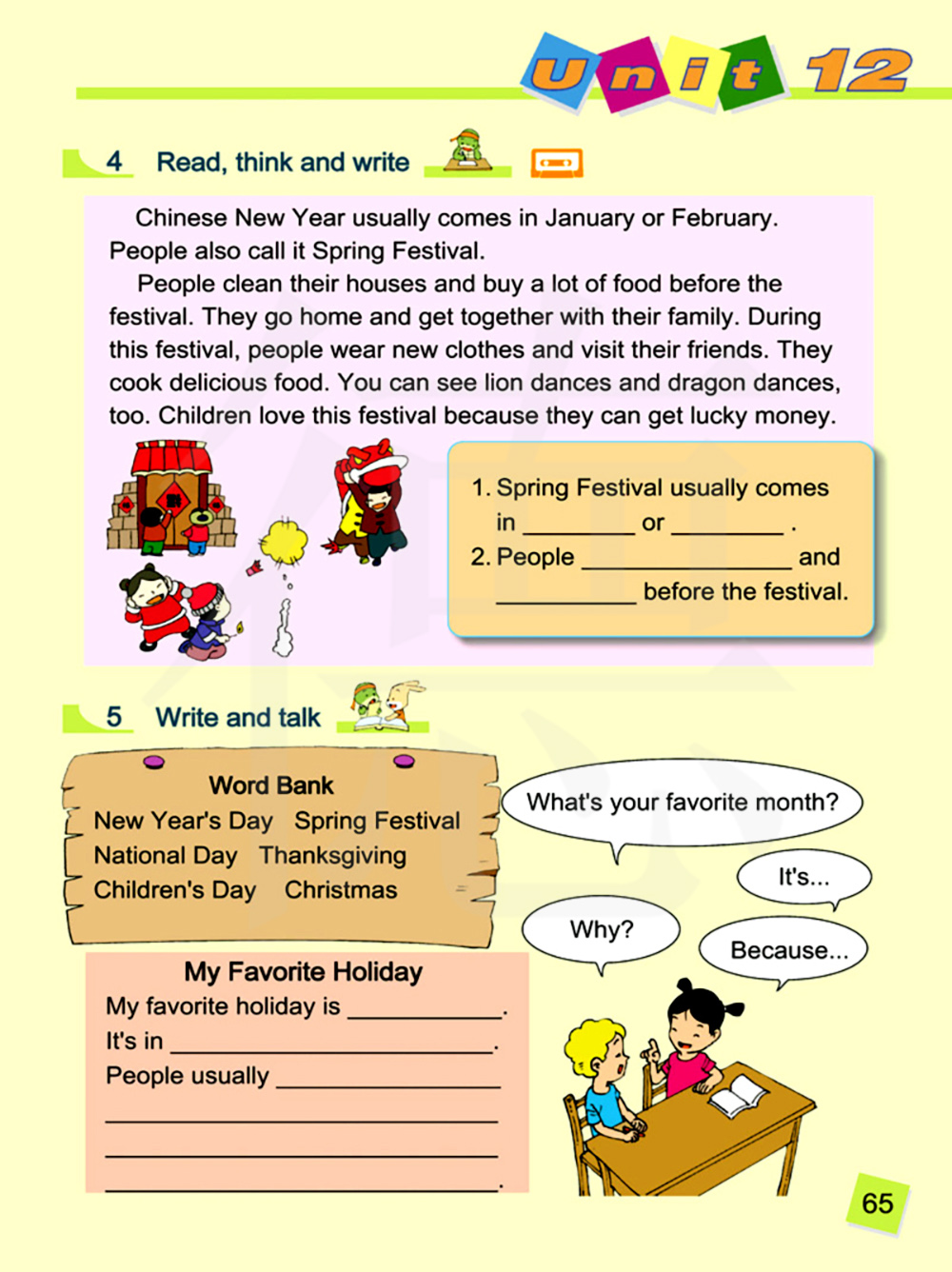 人们打扫自己的房子,节日之前买很多的食物。他们回家和家人团聚。 在这个节日期间,人们穿新衣服,拜访他们的朋友。他们做美味的食物。你也可以看到舞狮子和舞龙。孩子们喜欢这个节日,因为他们可以得到压岁钱。
