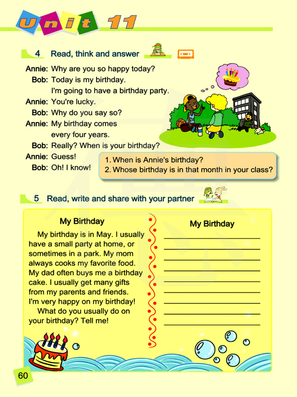 我的生日在五月。我通常在家或者有时候在公园举行小型的生日派对。我妈妈总是做我最喜欢吃的菜,我爸爸通常给我买生日蛋糕。我通常收到很多父母和朋友的礼物,在生日的时候我很开心。