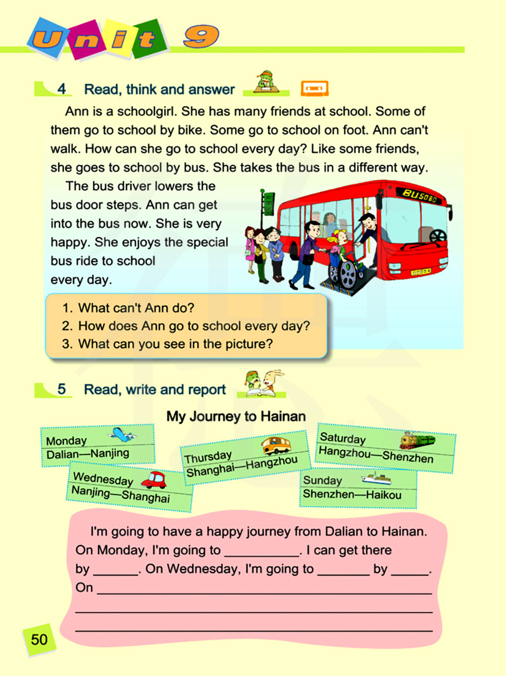 安是个学生,她在学校有许多朋友。一些人骑自行车去上学。一些步行去上学。安不能走路。她每天怎么去上学呢?像一些朋友,她乘公共汽车去上学。她用不同的方式乘公交。