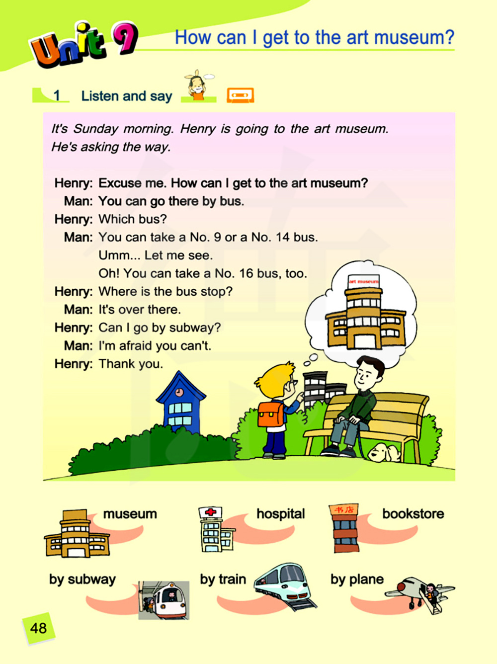 这是星期天的早晨。亨利要去艺术博物馆。他正在问路。