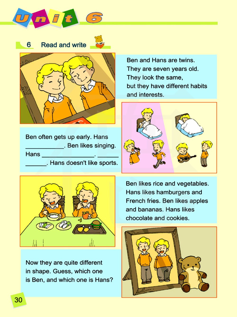 本和汉斯是双胞胎,他们7岁。他们长得一样,但是他们有着不同的习惯和爱好