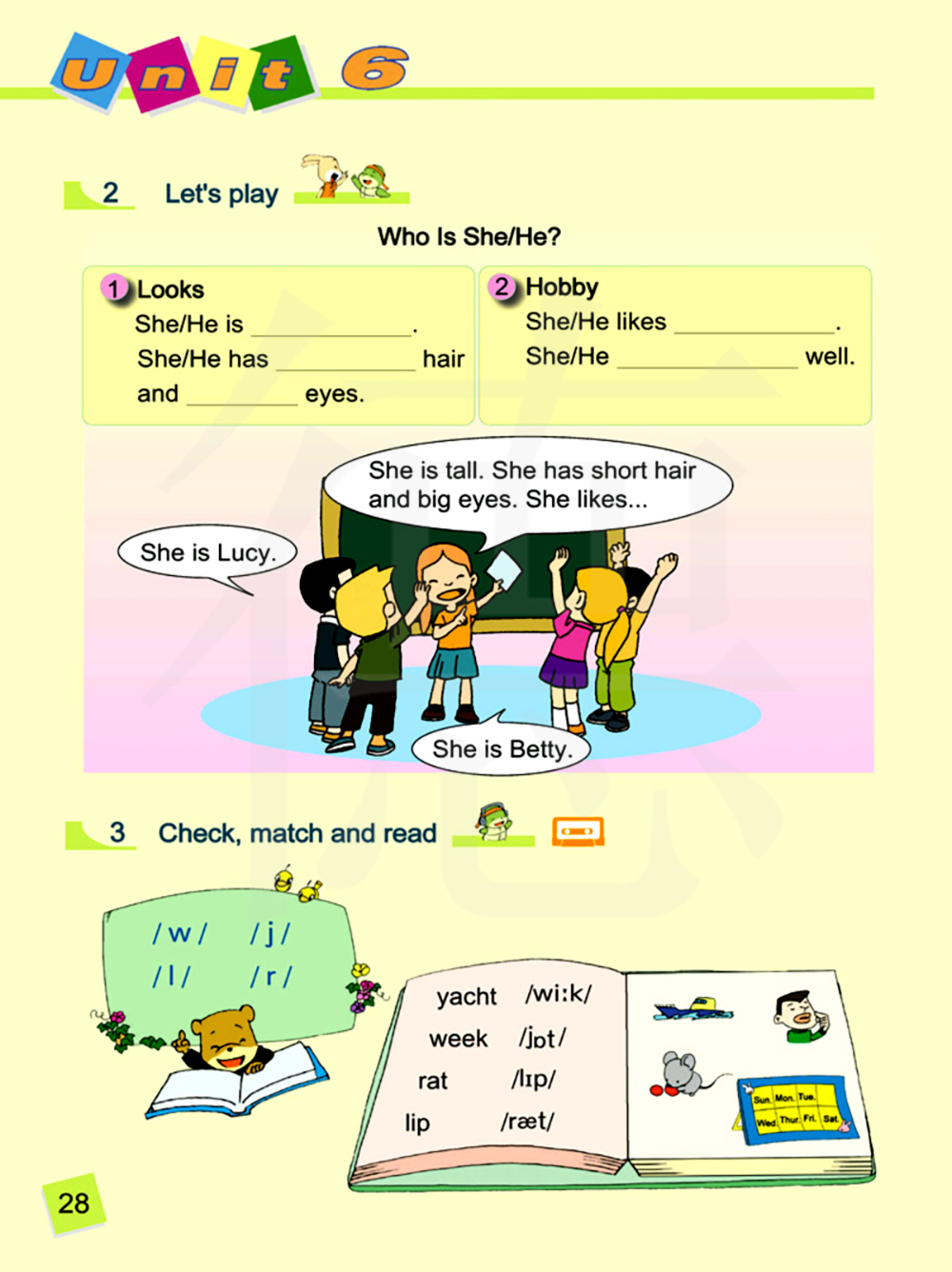 她长得高。她留着短头发和有一双大眼睛。她喜欢……