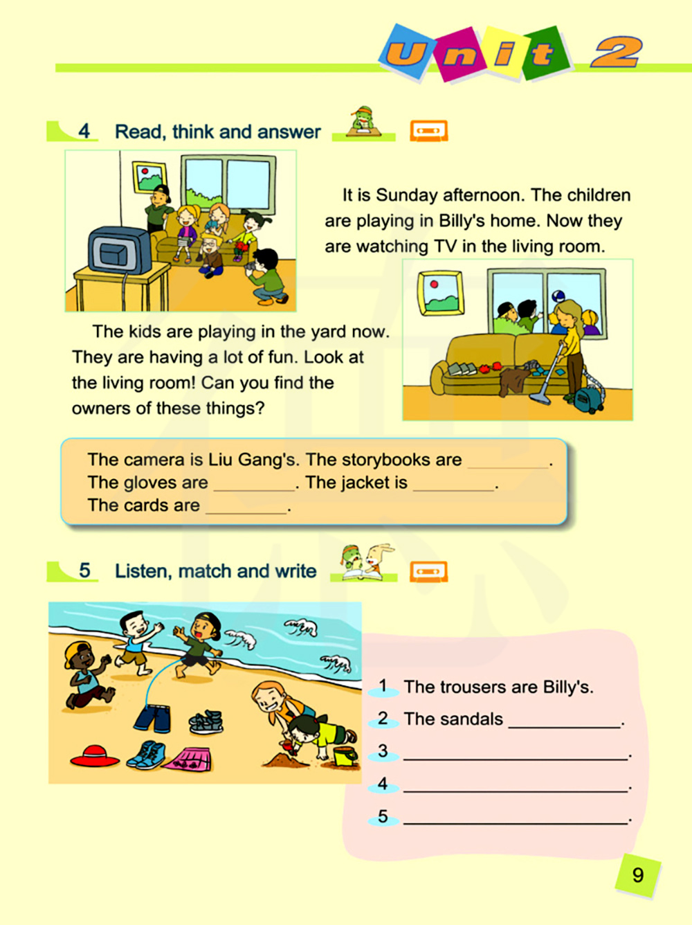 孩子们现在在院子里玩。他们很开心。看客厅!你能找到这些物品的主人吗?