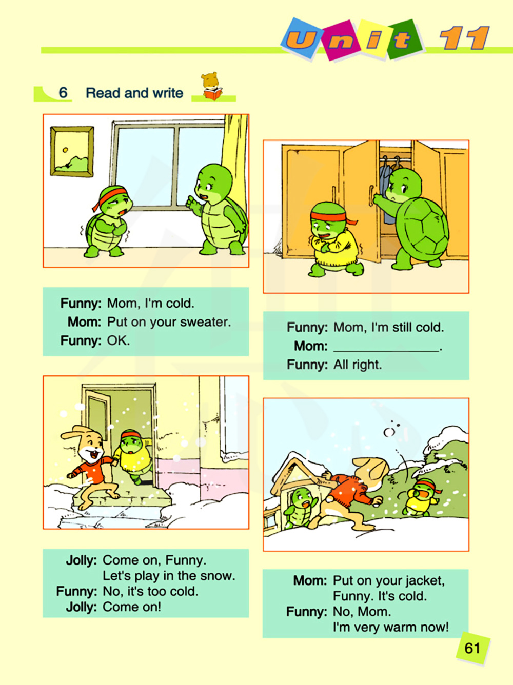 穿上你的夹克,方妮。天气很冷。 不,妈妈,我现在非常暖和
