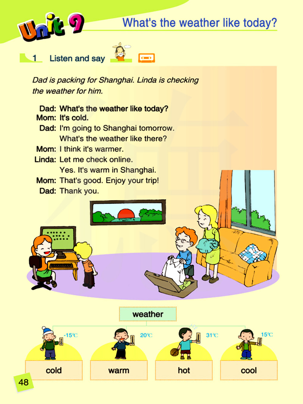 爸爸正在收拾行李去上海琳达正在为他查询天气