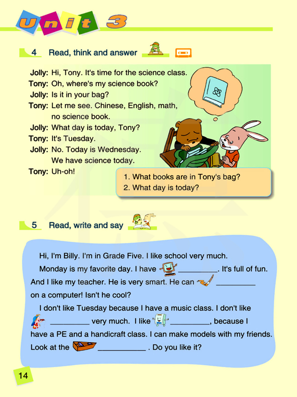 我看看。语文书,英语书,数学书,没有科学书。今天星期几,托尼?