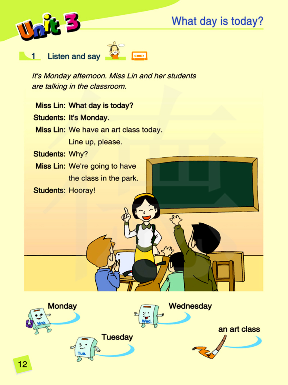 今天我们有一节美术课。请排好队。 为什么?