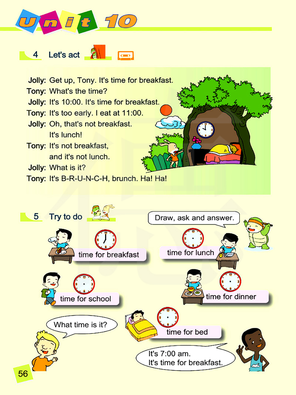 起床,托尼。早餐时间到了。 什么时间了? 十点了。早餐时间到了。