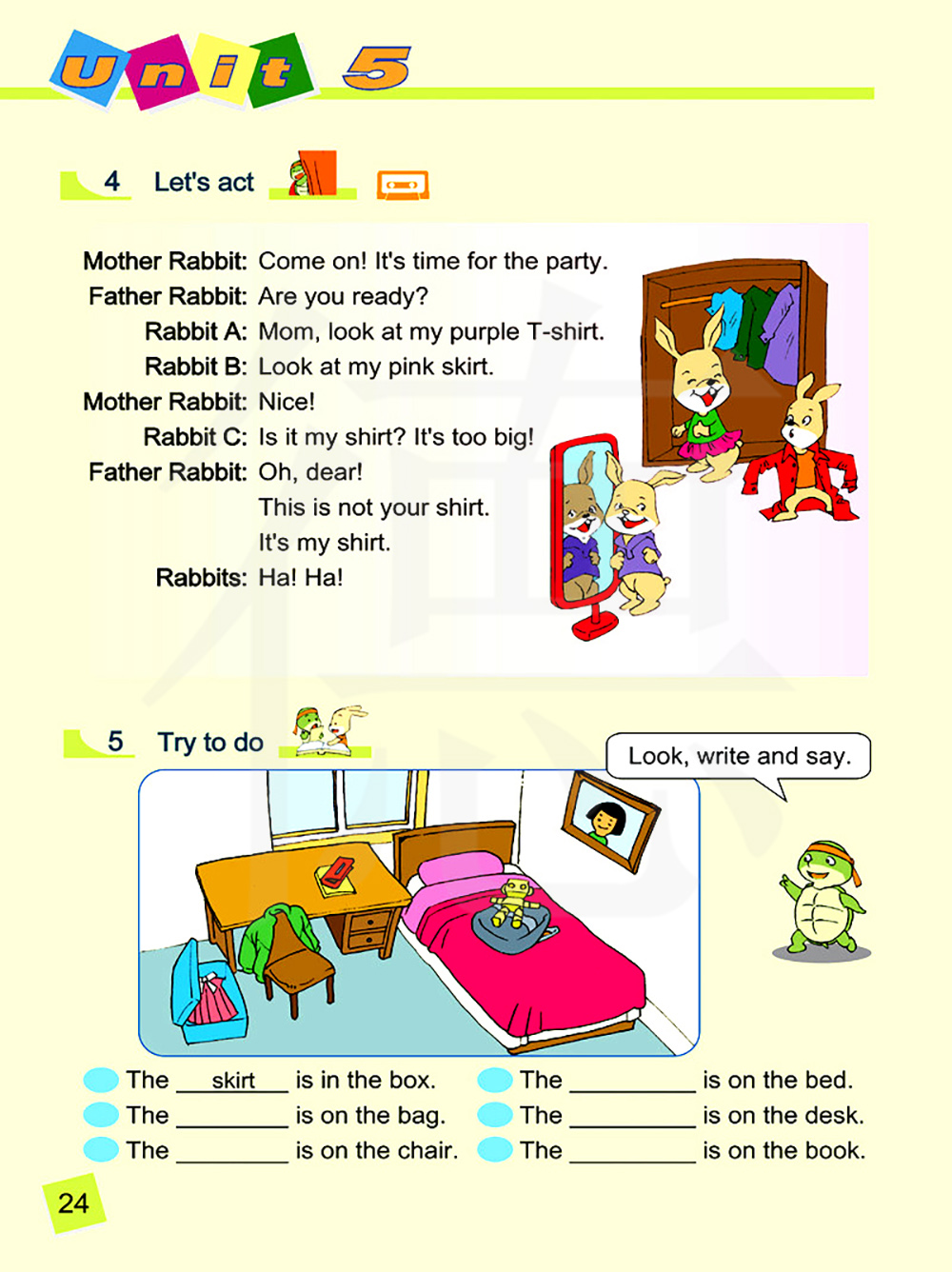 看看我的粉红色裙子。 很好! 它是我的衬衫吗?太大了!