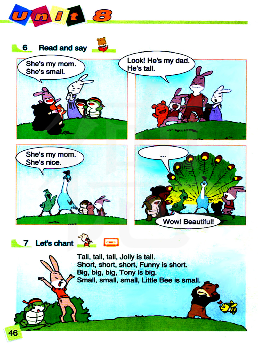 高的,高的,高的,乔利是高的。矮的,矮的,矮的,范尼是矮的。大的,大的,大的,托尼的个头很大。小的,小的,小的,小蜜蜂的个头很小