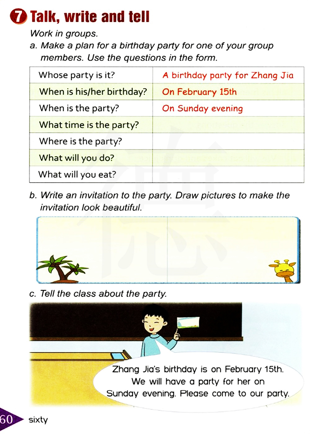 张佳的生日在二月十五号。我们将会在星期天晚上为她举行一个聚会。请来我们的聚会