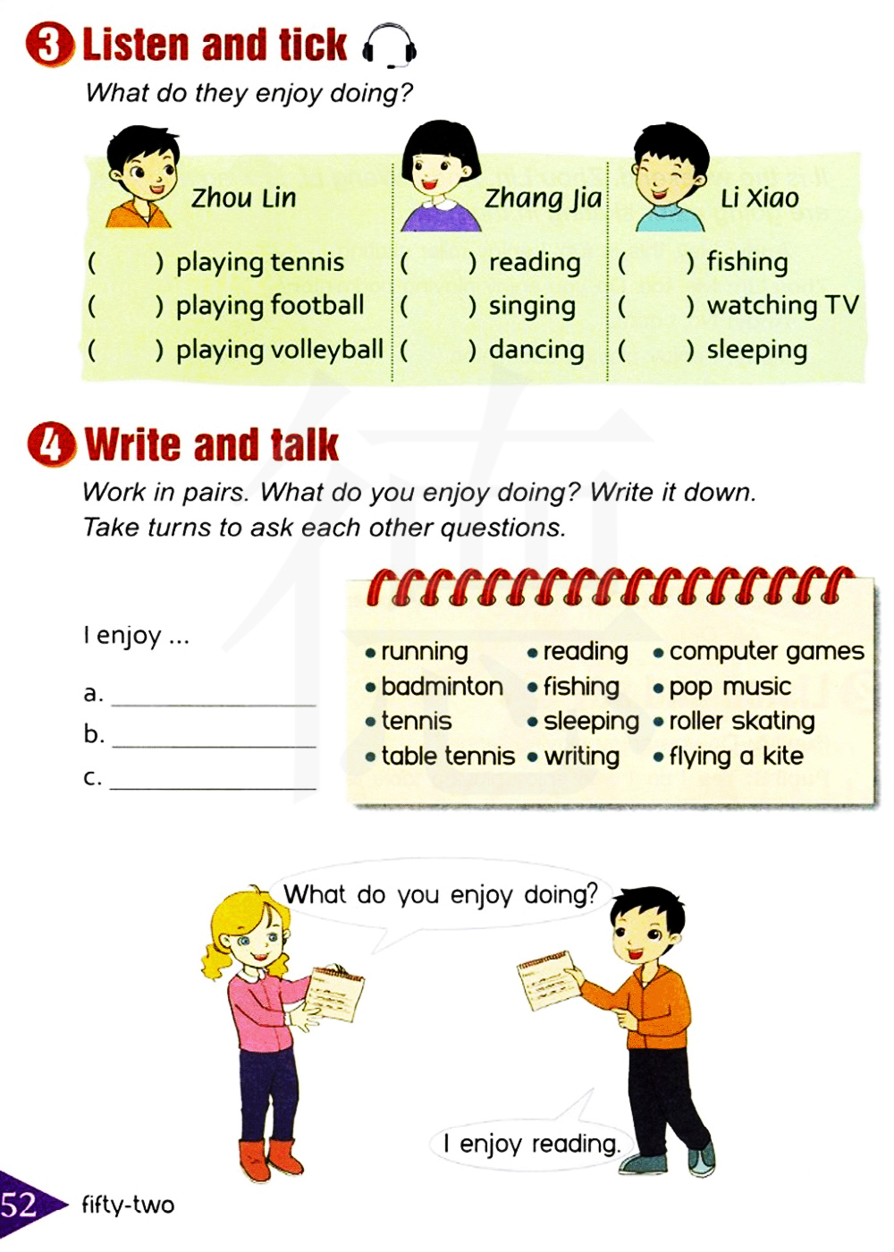 两人一组练习。你喜欢做什么?把它写下来。轮流互相问问题