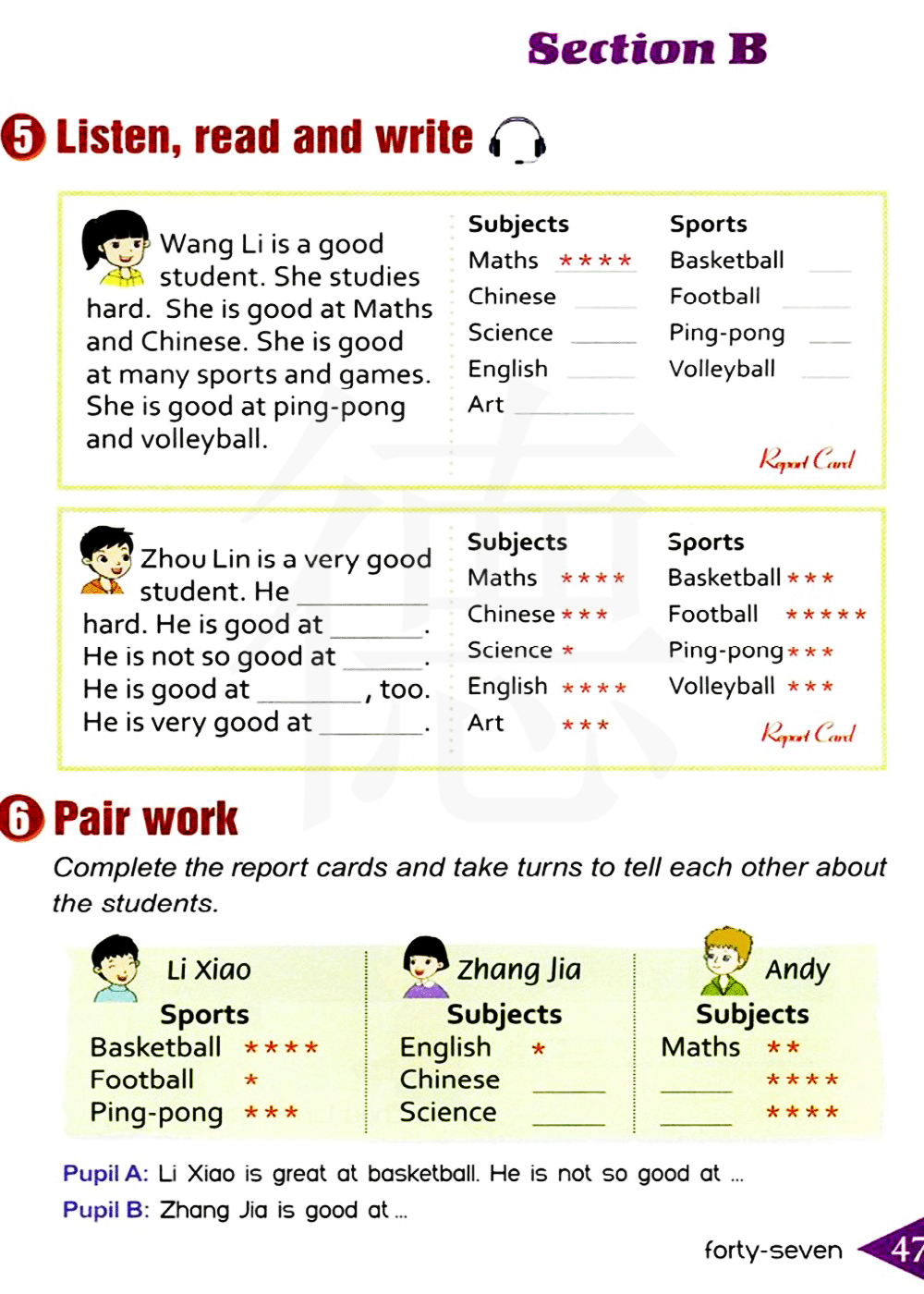 完成报告卡片并轮流告诉对方关于这些学生的情况