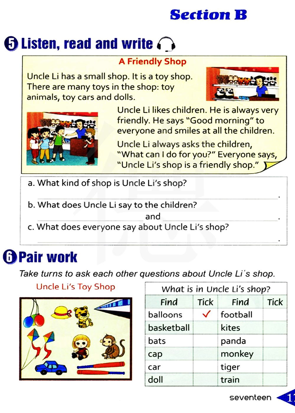李叔叔有一个小商店。它是一个玩具店。商店里有很多玩具:玩具动物、玩具小汽车和玩具娃娃。