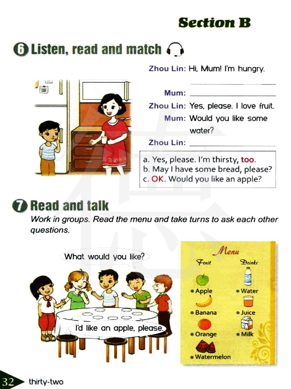 a 好的,谢谢,我也渴了 b 请问我可以吃些面包吗? c 好的,你想要吃个苹果吗?