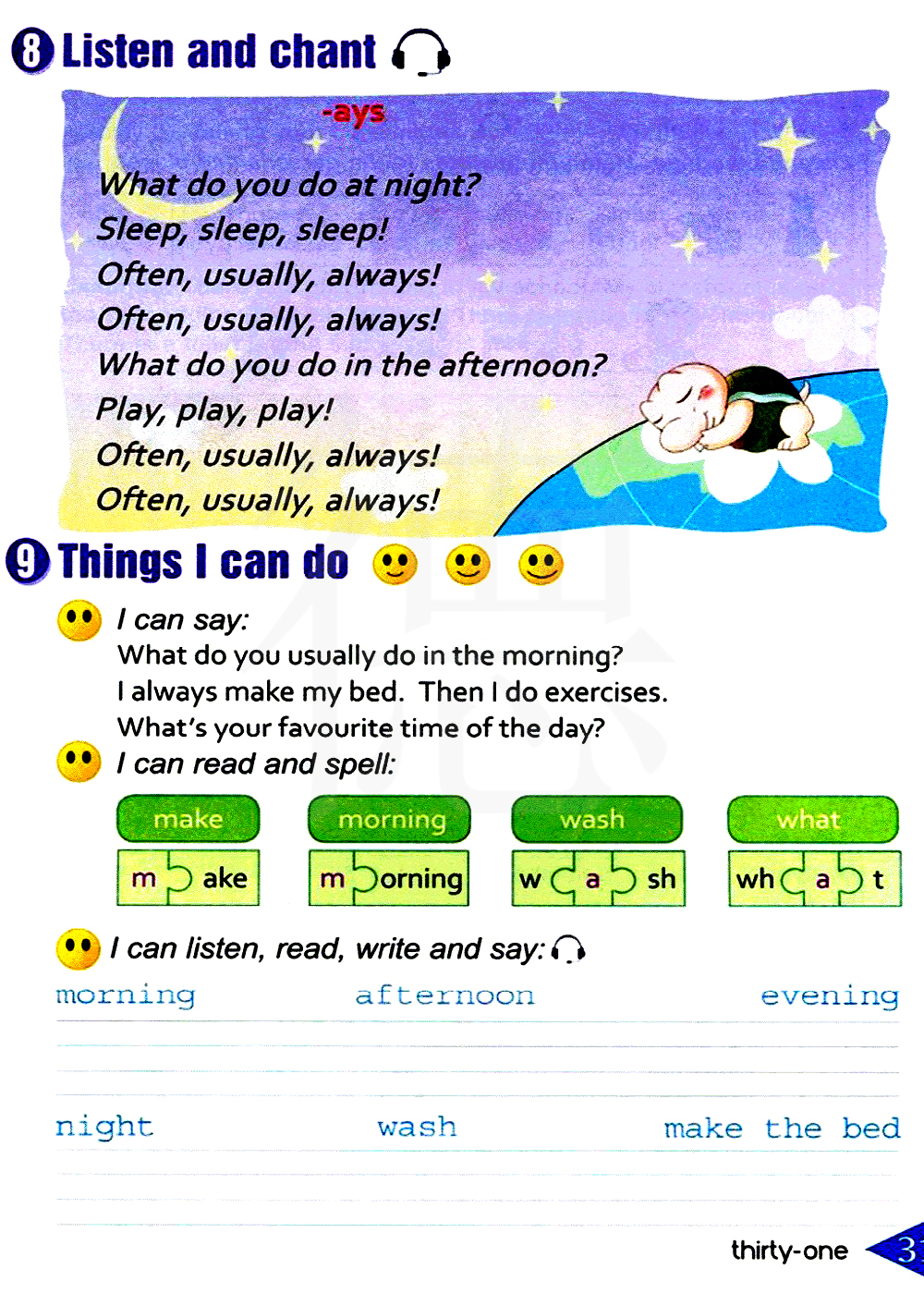 你通常在早晨做什么? 我总是整理我的床铺,然后我锻炼。