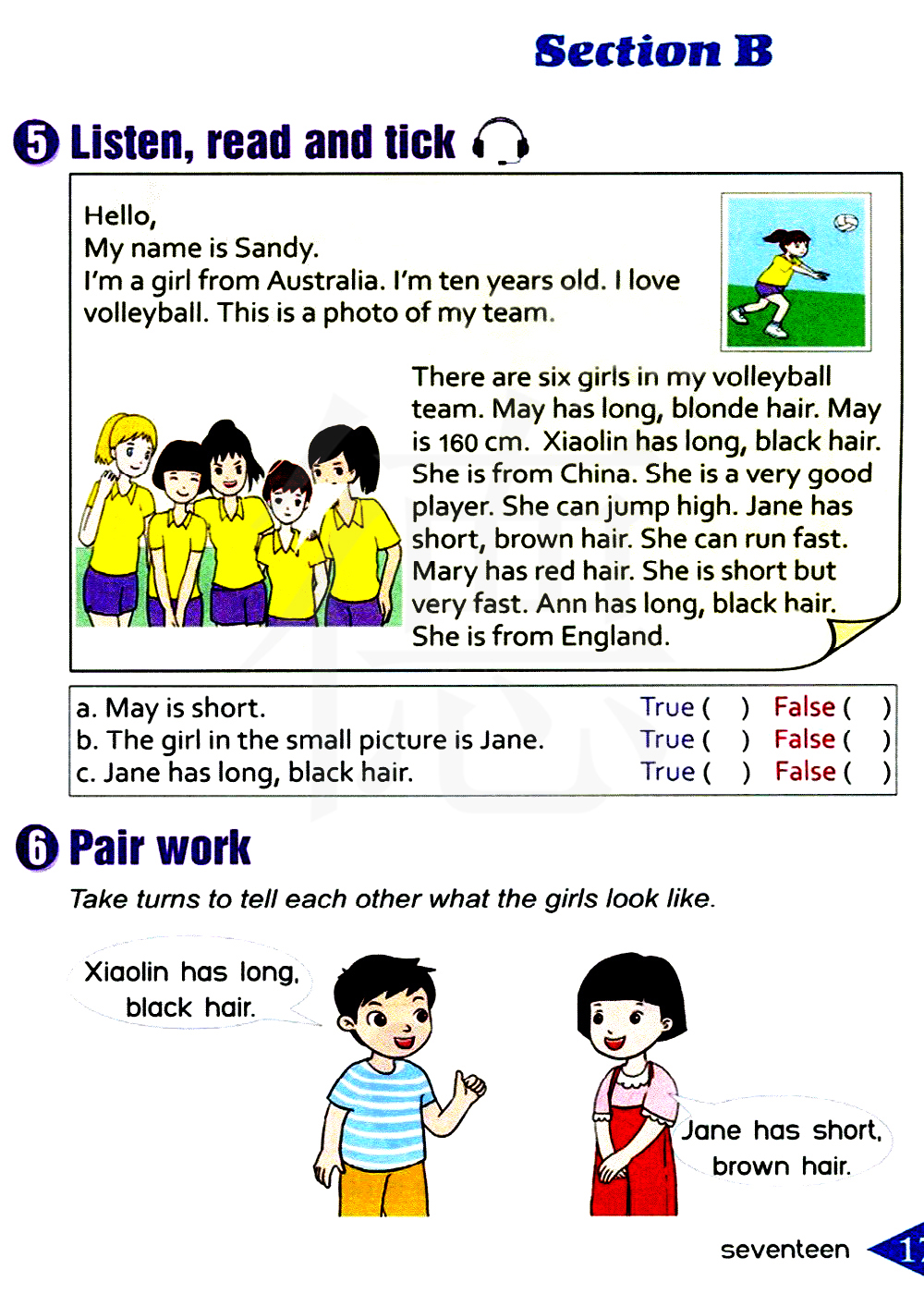 我的排球队有六个女孩。梅有着金色的长发。梅身高1米6。.小林有一头黑色的长发。她来自中国。她是一名非常好的队员。她能跳得很高。简有着褐色的短发。她能跑得很快。玛丽有着红色的头发。她很矮,但是非常快。安有着黑色的长发。她来自英格兰。