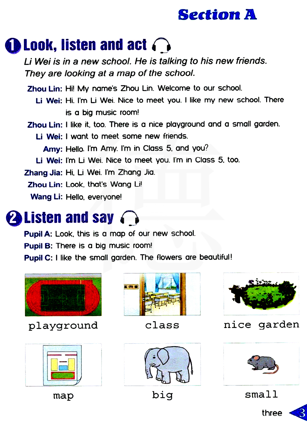 嗨!我叫周林。欢迎来到我们学校。 嗨!我叫李伟。很高兴见到你。我喜欢我的新学校。这儿有一个大的音乐室!