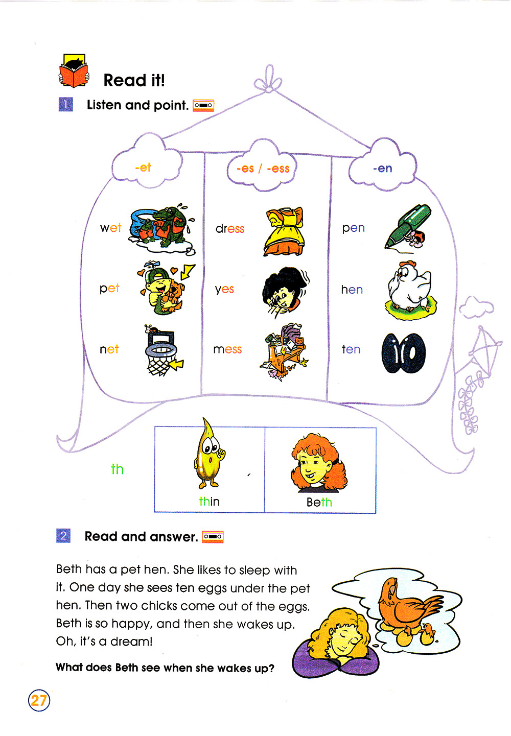 贝丝有一只宠物母鸡。她喜欢和它一起睡。有一天她发现母鸡身下有十个鸡蛋。随后两只小鸡从蛋里面破壳而出。贝丝很开心,于是她醒来了。噢,原来是一个梦!