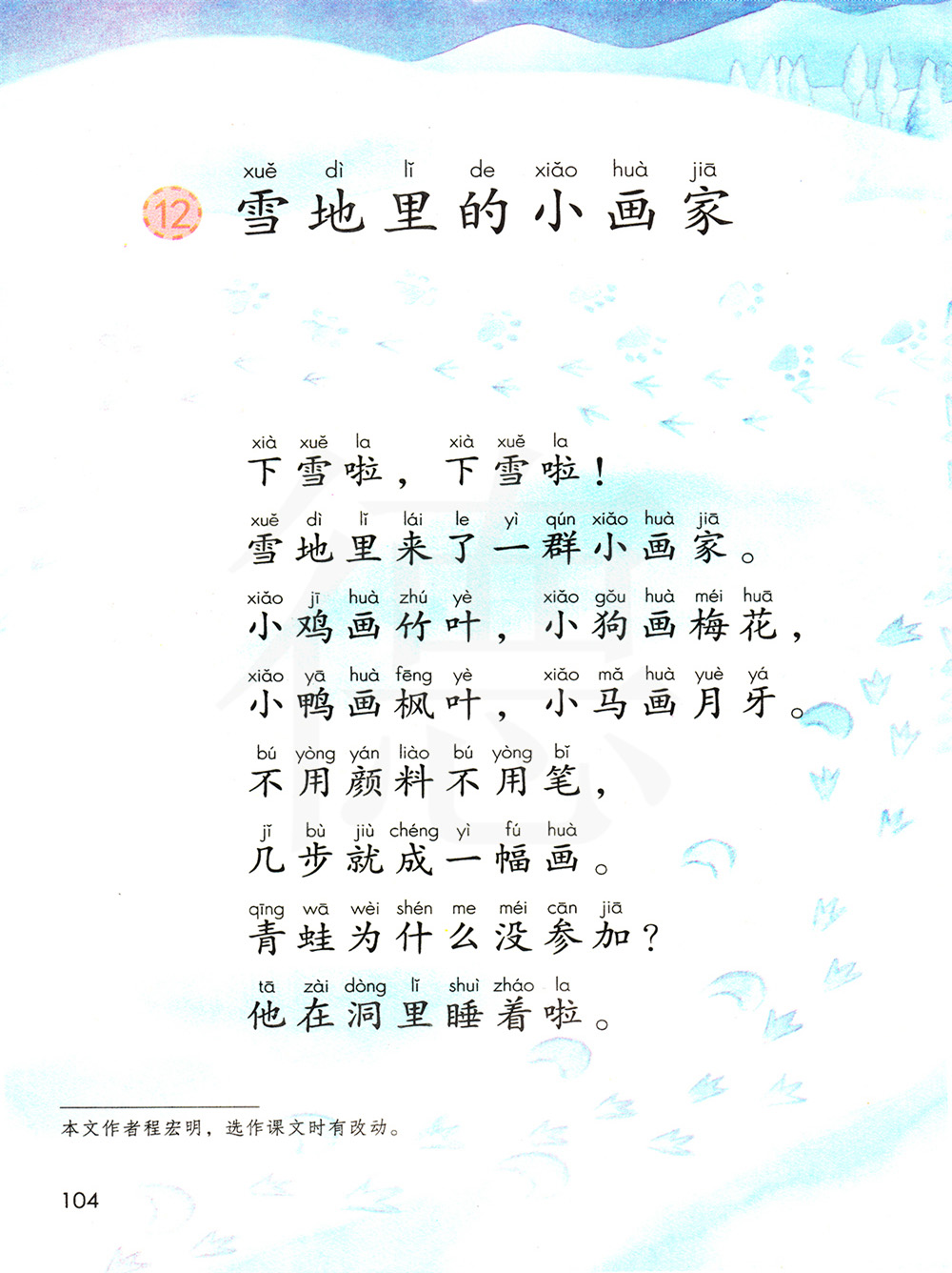 “竹叶”是竹子上面的叶子,出示实物,让学生观察,这里指小鸡的爪子在雪地上留下的脚印也说明了小鸡爪子的形状。