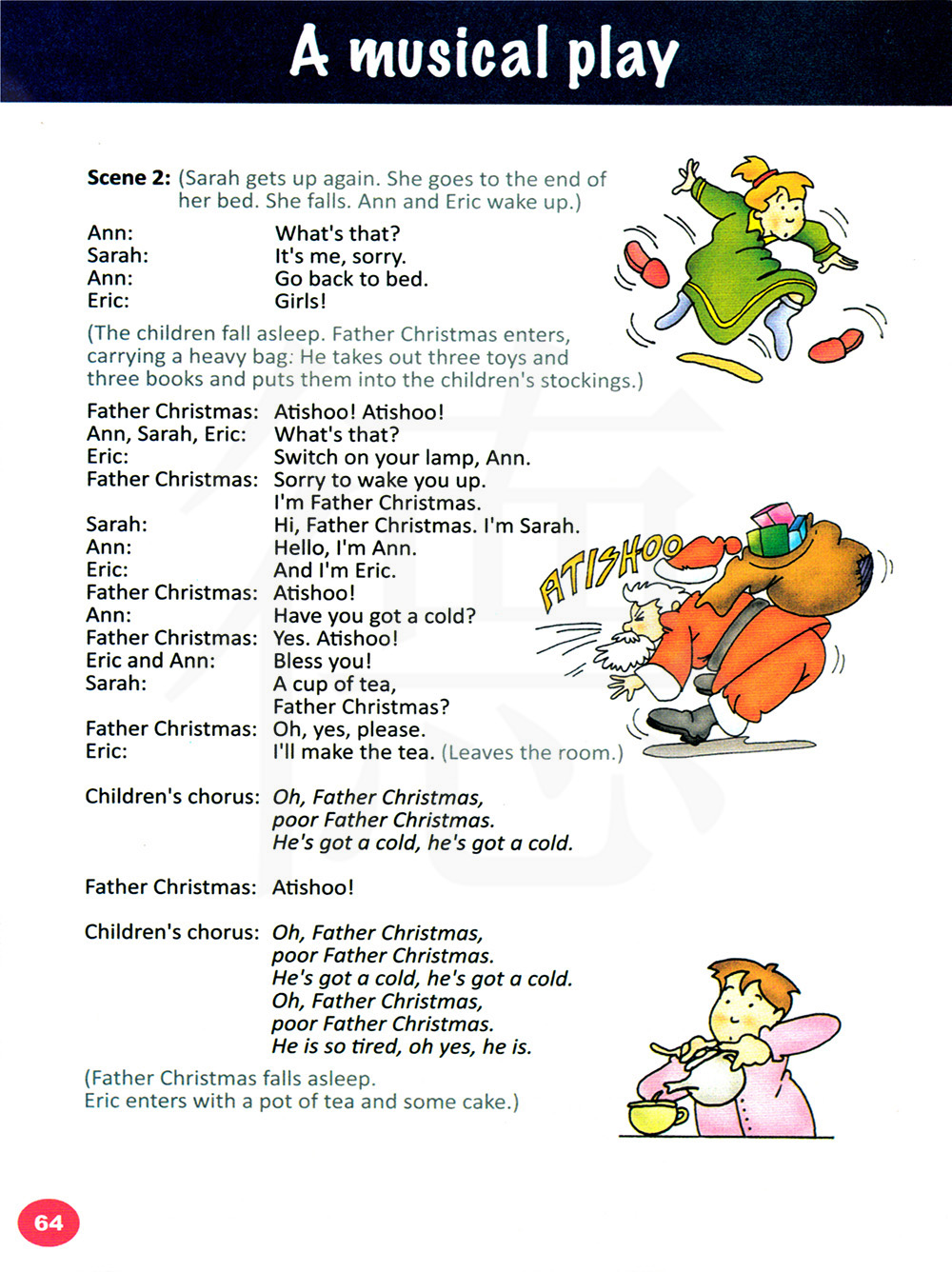 (圣诞老人睡着了。埃里克拿着一壶茶和一些蛋糕进来了。)