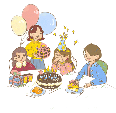invite your friends to your partycelebrate your birthday with your friendsgive a birthday card to your friendtimeafterthenmebyestar-shaped cakeheart-shaped cakejellyapple piekindchocolateice-creamcandysurelight the candlessing the birthday songmake a wishblow out candlescut the cakeeat the cakehereforlight