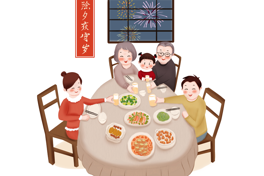 例句:On Chinese New Year's Eve all family members enjoys big, delicious meal.