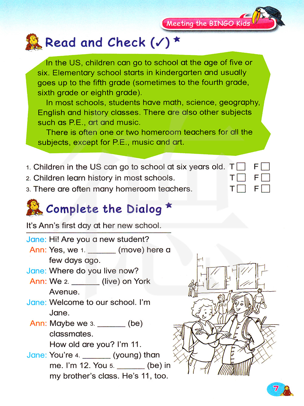 在美国,孩子们五或六岁就可以上学了,小学开始于幼儿园,并且,通常持续到五年级,有时候是四年级,六年级或八年级