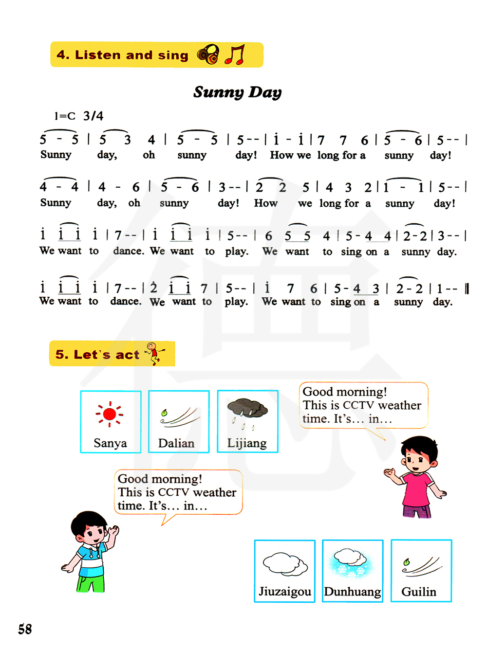 晴天 晴天,哦晴天!我们是多么渴望晴天啊!晴天,哦晴天!我们是多么渴望晴天啊!我们想去跳舞。我们想去玩。我们想在晴天去唱歌。我们想去跳舞。我们想去玩。