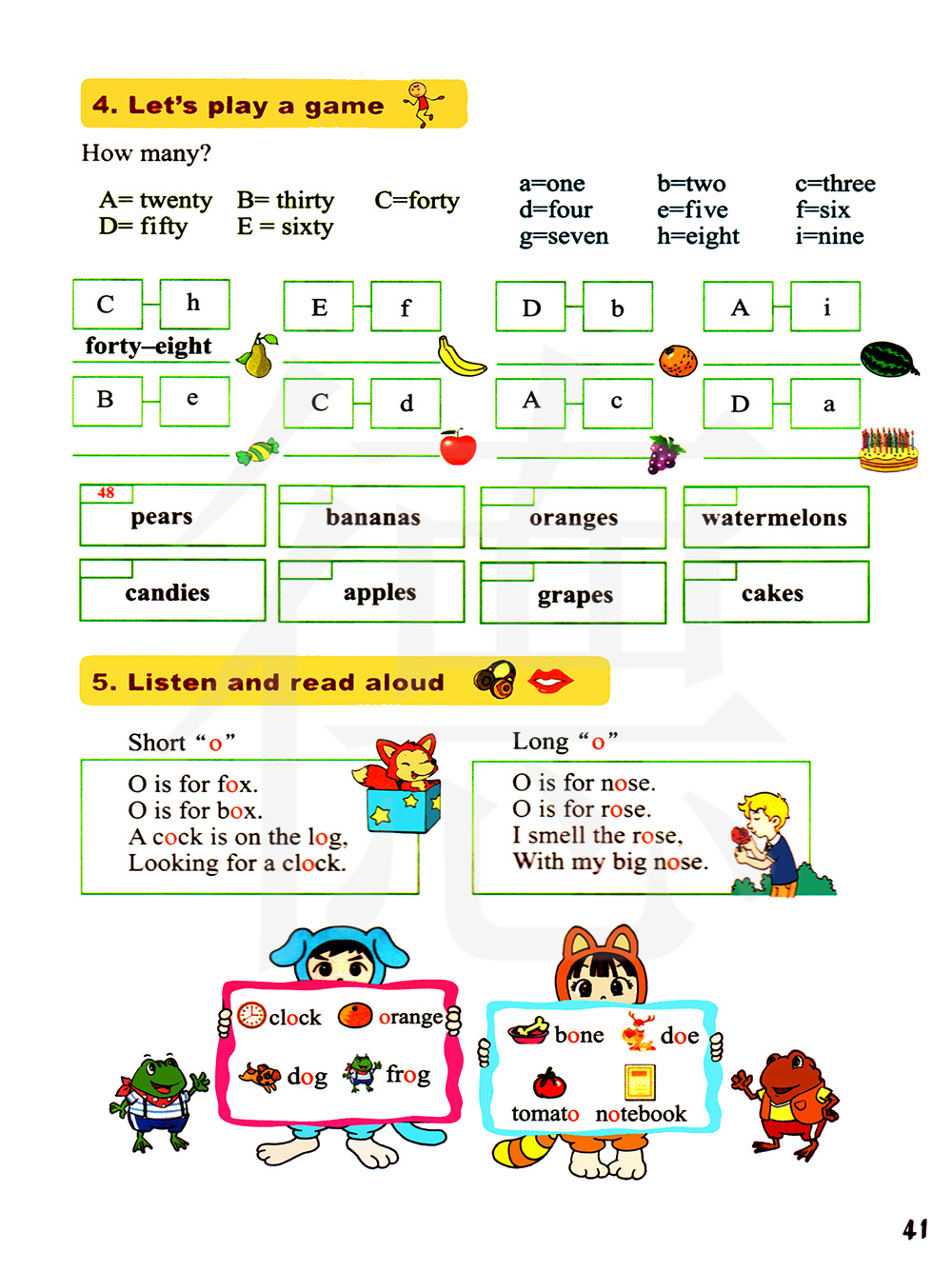短音"o" o代表狐狸 o代表盒子 一只公鸡在原木上,寻找着一个时钟。