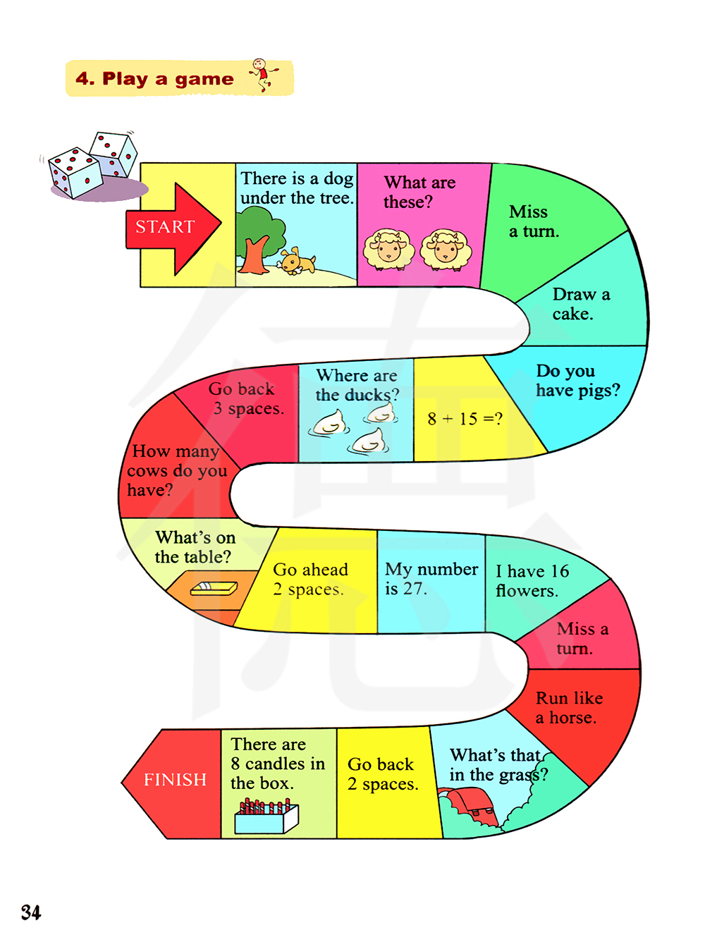 起点 树下有一只狗。 这些是什么? 失去一次机会。 画一个蛋糕。 你有猪吗? 8+15=? 鸭子在哪里? 后退三格。你有多少头奶牛? 桌子上有什么? 前进两格。 我的号码是27. 我有十六朵花。 失去一次机会。 像一匹马一样奔跑。那个在草丛里的是什么? 后退两格。 盒子里有八根蜡烛。 终点。