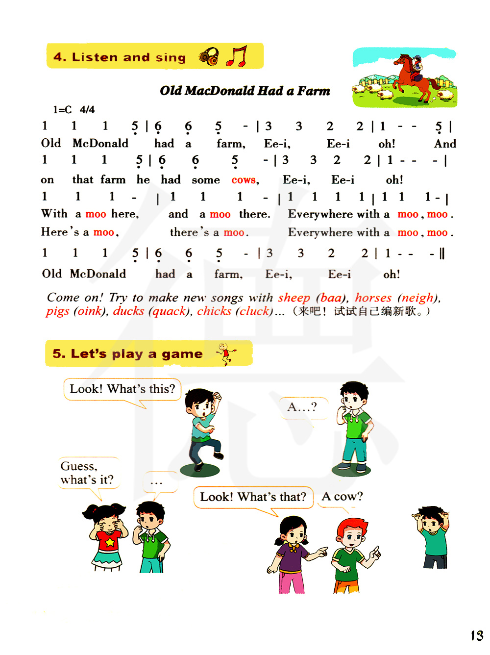老麦克唐纳有一个农场,咿呀,咿呀澳!而且他有一些奶牛在那个农场,咿呀,咿呀澳!这里有牛叫声,那里有牛叫声。到处都是牛叫声。老麦克唐纳有一个农场,咿呀,咿呀澳!老麦克唐纳有一个农场,咿呀,咿呀澳!!而且他有一些奶牛在那个农场,咿呀,咿呀澳!这里有牛叫声,那里有牛叫声。到处都是牛叫声。老麦克唐纳有一个农场,咿呀,咿呀澳!来吧试着用sheep(baa),horses(neigh),pigs(oink),