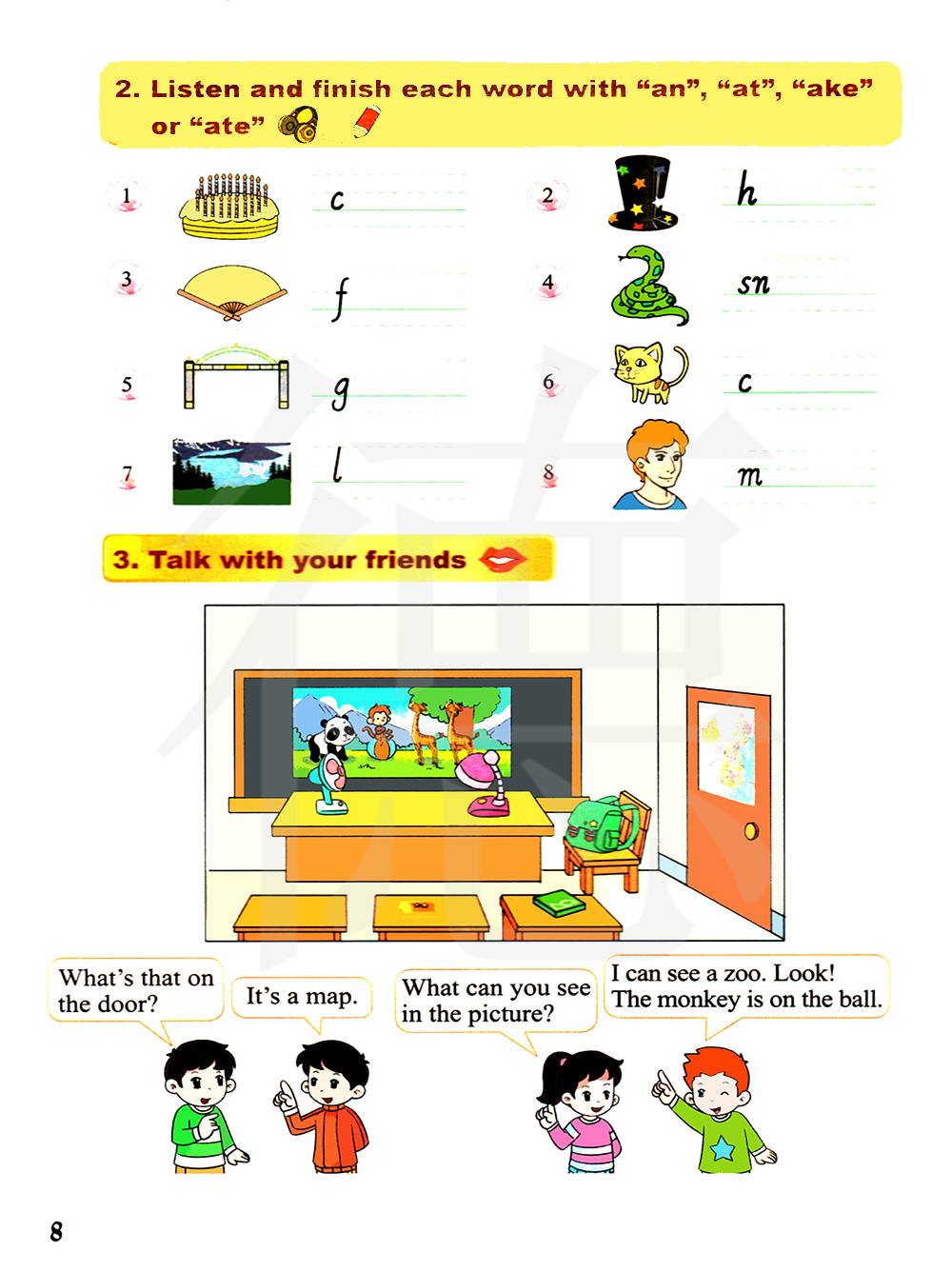 2.听一听并用"an","at","ake"或者"ate"来完成每个单词。