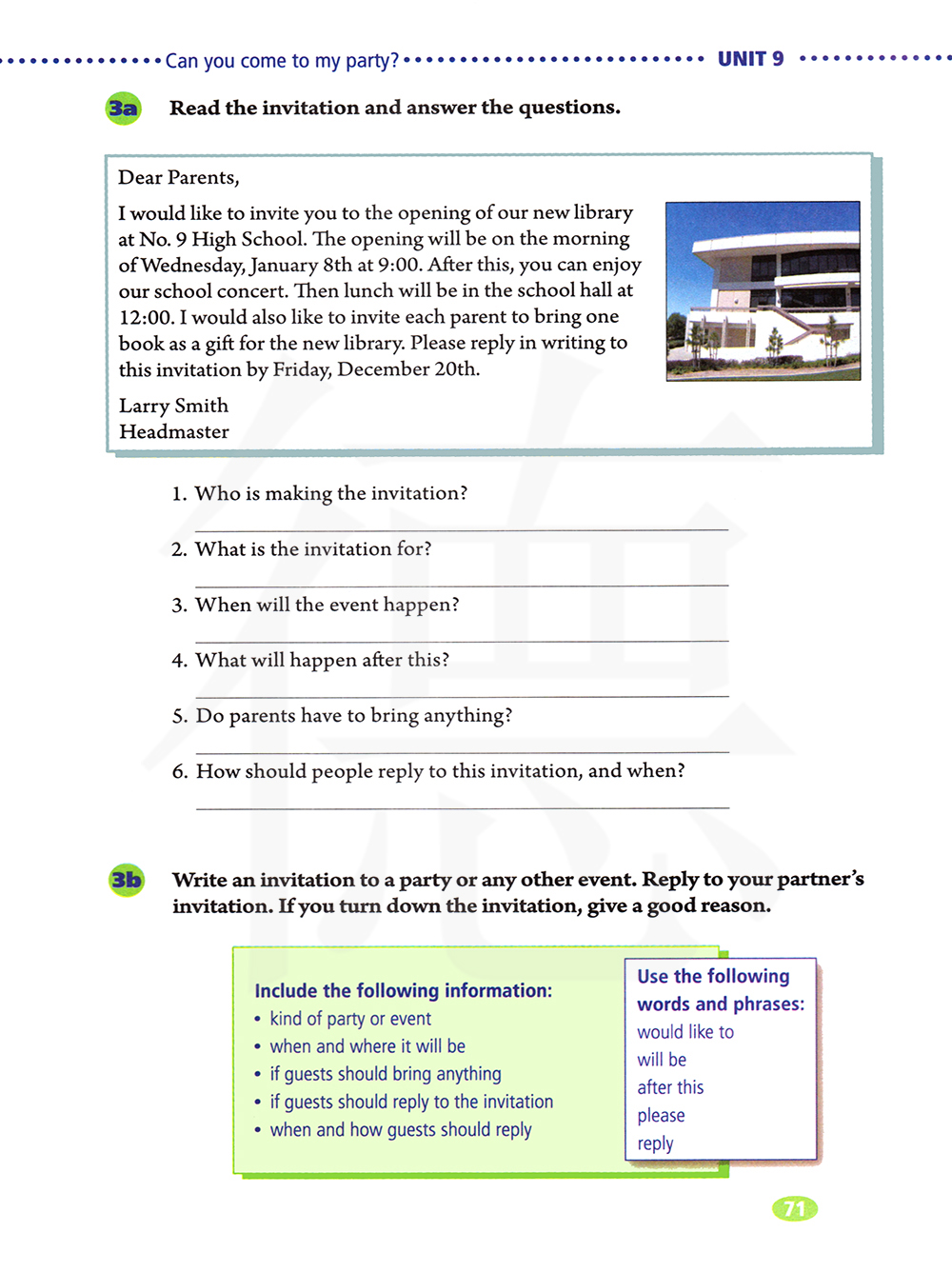 我想邀请你们参加我们第九中学新图书的开幕式。这个开幕式将在一月八号星期三上午九点举行。在这之后,你可以欣赏学校的音乐会。12点去学校餐厅吃中餐。我也想每一位家长带一本书作为学校新图书馆的礼物,请于12月20日星期五以前以书面形式回复邀请函。